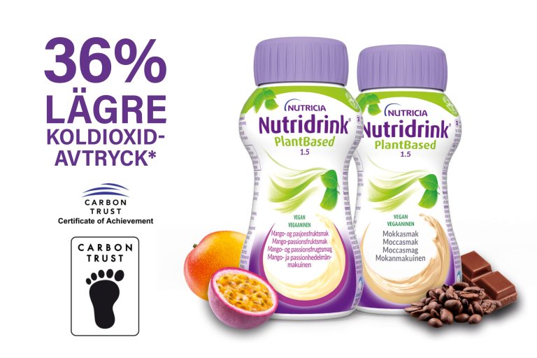 Nutridrink PlantBased har 36% lägre koldioxidavtryck än den mjölkbaserade Nutridrink. Båda produkternas koldioxidavtryck har mätts i enlighet med den internationellt erkända standarden ISO 14067 och har verifierats och certifierats av Carbon Trust 2023.